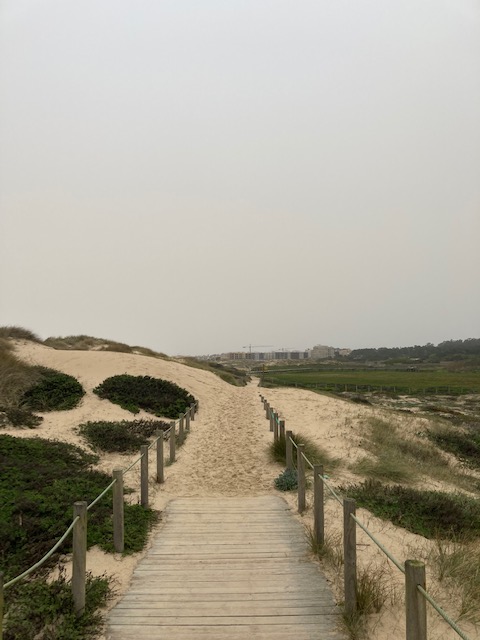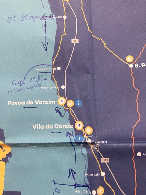Y en esas pasarelas ha llegado el hombre del mazo y me ha tambaleado. Un cansancio impensable se ha apropiado de mis miembros inferiores. Han aparecido dolores desconocidos hasta ahora y una tos impertinente y constante. La calima ha supuesto una merma importante en la calidad del aire que respiro y mis pulmones no filtran correctamente, como es lógico, esa contaminación. Todo ello, conjuntamente, ha propiciado la aparición de un agotamiento físico intenso. He tenido la suerte de estar cerca de Aguçadoura porque ciertamente necesitaba un descanso. Comer algo (un pan con mantequilla y un café con leche) y descansar protegido del aire irrespirable me ha dado el punto de vida adicional que necesitaba. Y tan solo llevaba 18 kilómetros. Relajarme y volver al lado positivo no ha sido verdaderamente complicado. Es más, me ha resultado muy sencillo. Es increíble la capacidad de la mente. Hay un objetivo, hay un destino y todo ello tiene un camino.