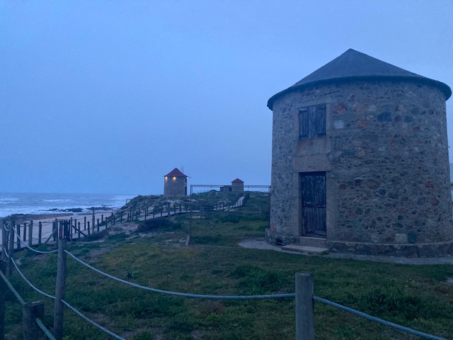 Aparecen molinos de viento en la línea de costa. Cuento cinco hasta donde llega mi vista. Sé que son molinos porque alguien me alertó. Creo que fue en la oficina de turismo de Matosinhos. El caso es que son edificaciones circulares de piedra (en apariencia) a las que les han quitado las aspas y están perfectamente mantenidas, ya que sirven de vivienda habitual. Y surge una nueva pregunta, lógica por otro lado. ¿Qué pintan unos molinos de viento en primera línea de playa? La respuesta es muy sencilla: para moler. Moler el grano que obtienen de sus cosechas. Y admirando el panorama, me saluda un hombre de edad avanzada. El buen camino es un deseo que se va repitiendo desde mi salida de Oporto. Le pregunto por los molinos, por su uso y por lo que significa para la zona. Son apenas unos minutos de conversación, pero me enriquece mucho. La avidez de conocimiento ha crecido exponencialmente en mi. No sé si será un estado pasajero o constante de aquí en adelante. Me explica que del mar recogían las algas, las secaban y luego las usaban de fertilizantes para el campo. Me dice que este mar tiene aguas muy yodadas y que por ello las algas son magníficas para el cultivo. Luego, continúa, el grano de las cosechas se llevaba a los molinos que, con el constante viento litoral, no paraban de funcionar. Y claro, hago el preceptivo ejercicio imaginativo. Otras épocas, otros caminantes viendo los molinos, pero con aspas, y los sacos de harina en las carretas. Y mirando al mar pienso en los duros inviernos y sus temporales. No son playas para baño, posiblemente.
