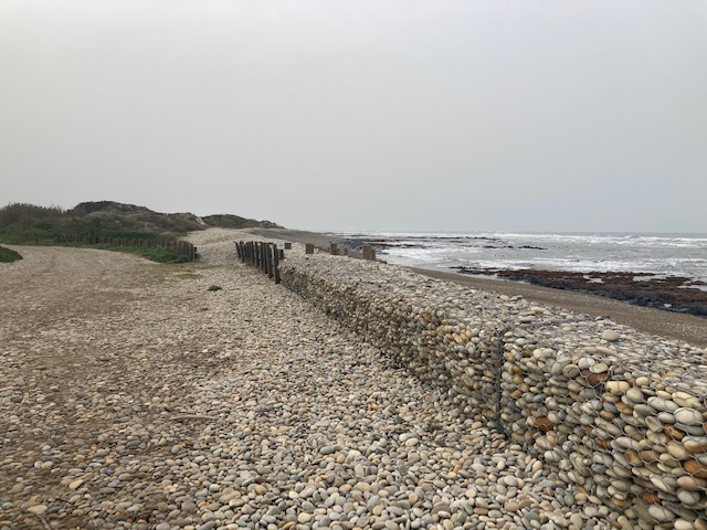 Es fácil encontrar el camino litoral. Y con el camino vuelven las pasarelas, el mar bravo y las dunas. Las pasarelas son discontinuas. Se añade un nuevo elemento que molesta el camino agradable. Son los adoquines pequeños. Menos mal que no son recorridos grandes. El dominio de la pasarela sobre la arena vence a los adoquines, para alivio de mis articulaciones. Caminar entre pinares y mar, sin presencia humana, es una sensación de lo más agradable. Por momentos pareciera que estoy en un parque, muy bien cuidado y limpio. Es una Eco Vía Litoral y parece lejos del mundo, al menos en estas fechas.