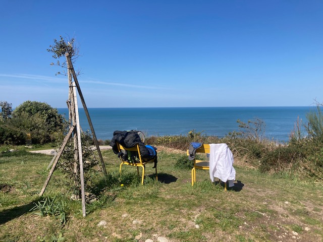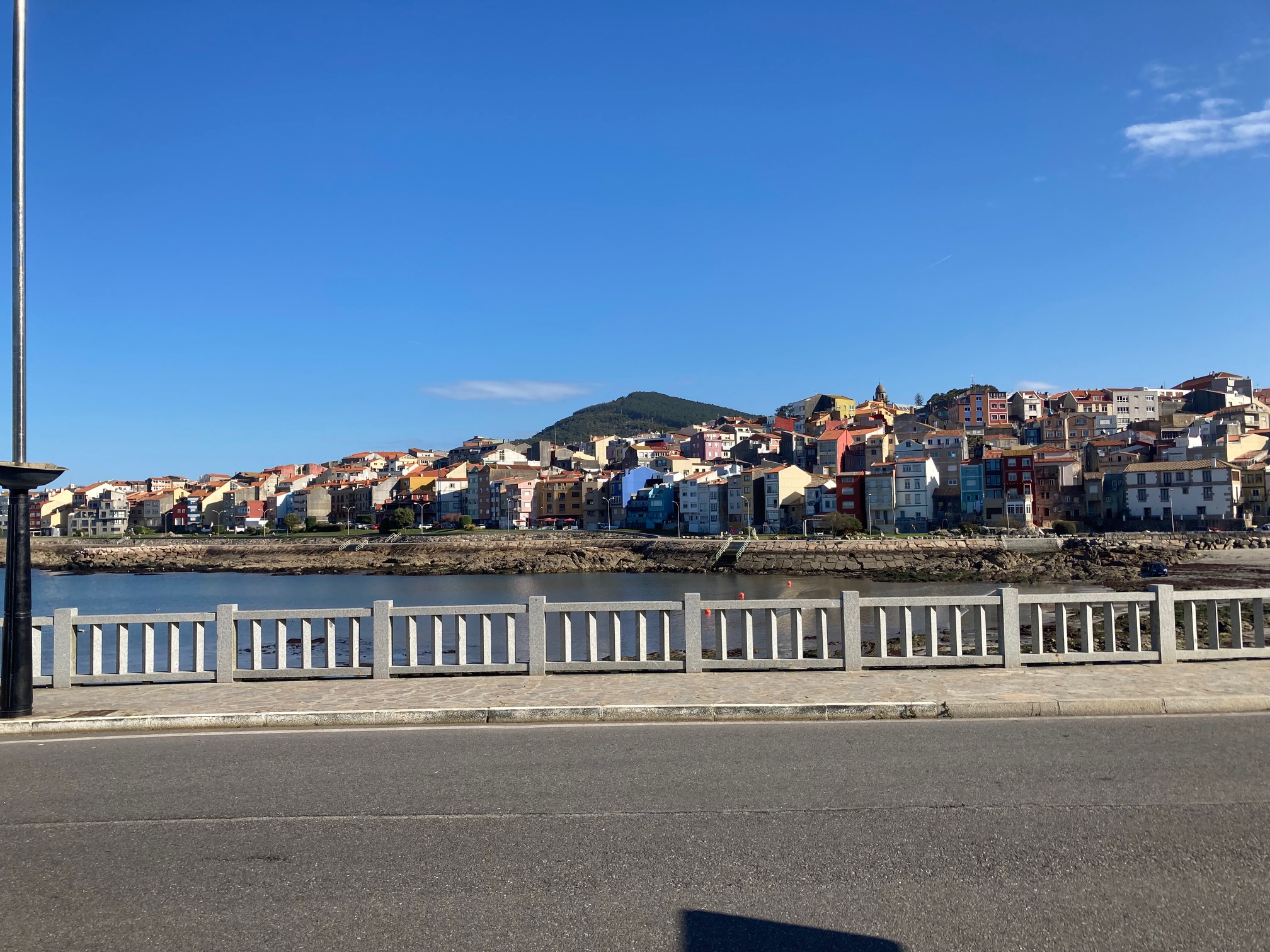 Pasado la localidad, comienzo a ver algún caballo suelto, entre terrenos privados y otros que parecen no serlo. El camino se convierte en carretera y aparecen algunos tramos con arcén reducido en exceso y abundante circulación. Mi batería del teléfono continua perdiendo carga por algún lado. O eso o está para una despedida. Necesito encontrar acomodo para pasar la noche y sin el auxilio de mi teléfono no será fácil hacerlo. La carretera marca destino Mugaz y lo mejor es continuar hasta encontrarme con algo. Ese algo es una cafetería y una casualidad, nuevamente. Mi parada es para cargar el móvil y para ello me veo en la obligación de consumir. A espaldas, el bar tiene una terraza en primera línea de mar. Lo normal es preguntar por si hay algún lugar para pasar la noche. El camarero me dice que hable con un señor que está en una mesa, con varios amigos, en la fachada que da a la carretera. Es el propietario jubilado de un hotel que se encuentra a unos cuatro kilómetros siguiendo la carretera. Hace una llamada de teléfono y me confirma la reserva. Son cosas que pasan de vez en cuando. Hotel O Peñasco en Pedra Rubia.
