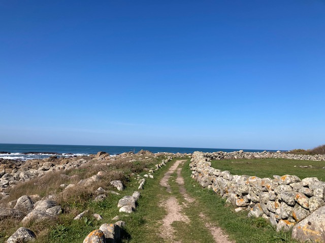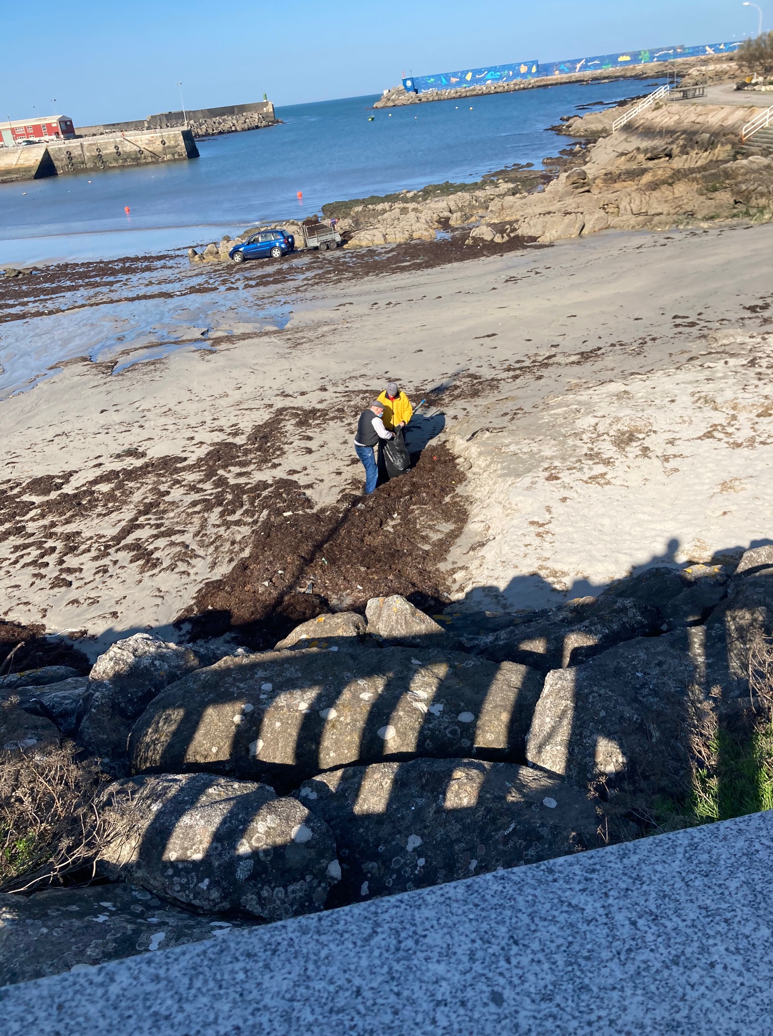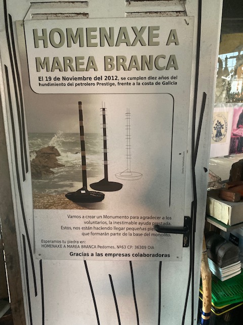 En esta zona hubo una boom comercial en los años treinta con los viveros de mariscos. A pie de costa, entre rocas, se creaban piscinas para tal fin. Unos metros más adelante, un par de operarios recogen algas. Recuerdo la información sobre su uso en agricultura. Tal vez tenga el mismo fin. La estatua del pescador manipulando redes domina la rotonda que salva el cruce de caminos. Ahora me es muy fácil seguir la ruta sin necesidad de mirar mapas. Las indicaciones son excepcionales. Para salir del pueblo paso por la Plaza de guía. Una pequeña capilla me despide. Estoy pensando en sellar en el lugar el pasaporte pero la celebración de un acto religioso me echa para atrás. Prefiero guardar ese «respeto».