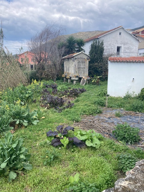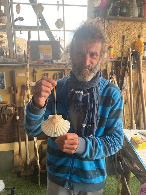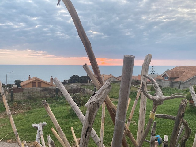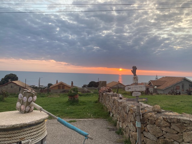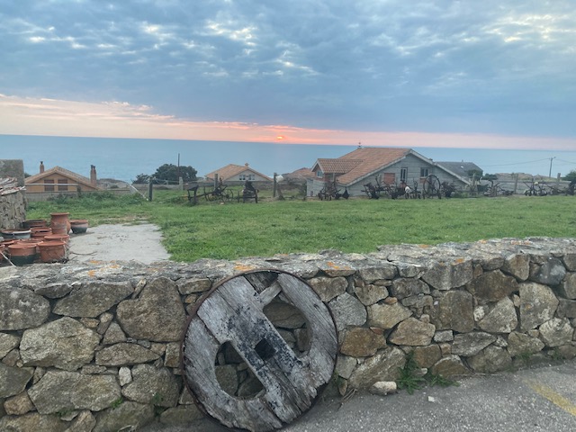 Es un personaje enriquecedor. Tiene su taller artesanal pegado al hotel. Conoce a tanta gente que debería tener un monumento. Se maneja en redes sociales y ahuyenta malos espíritus con sus obras. Me tomo una cerveza con él mientras me relata anécdotas y me ilustra sobre cosas del camino. Defiende el terruño e intercala comentarios sobre la puesta del Sol con alguna historia personal. El hotel tiene bar-restaurante con terraza en parte de la planta baja. Su horario es curioso, al menos en esta época del año. Cierra con luz del día aun, aunque me permiten el uso de las mesas en la terraza mientras doy cuenta del bocadillo que les pedí justo antes de cerrar la cocina. Como Xabi está al lado de la terraza, se une a mi y de manera natural comienza a fluir la conversación entre nosotros. Me explica, entre muchísimas cosas, el valor que tenía para los antiguos marineros la roca que da nombre a la parroquia (Pedra Rubia). Debido a su color rojizo, hacía las veces de faro-guía para ellos. Termina la jornada y me despido de él. Me deja un montón de información y me acerca a nuevos conocimientos. Es una sensación extraña cuando te despides de alguien con la certeza de no volverlo a ver nunca más.