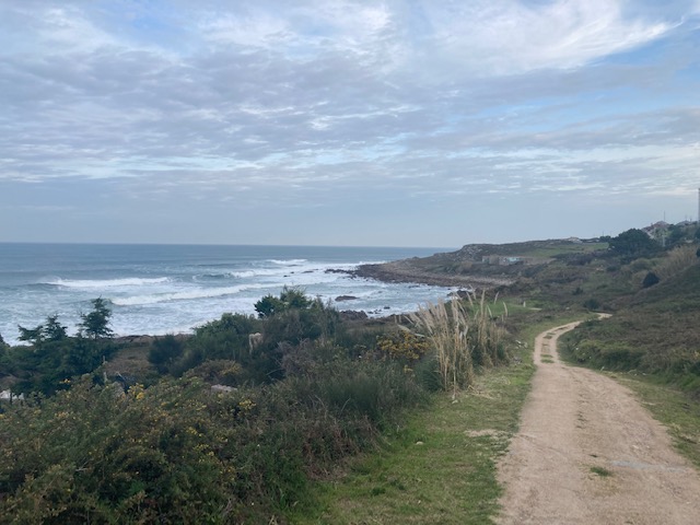 As Mariñas es el pueblo y no tiene cafeterías abiertas a estas horas. No lo entiendo. Ya no puedo parar. No es una opción. Tal vez sea cabezonería por mi parte. Veo, no muy lejos, la figura de un faro. Debe ser el faro del cabo Silleiro. El paisaje pasa de bonito a maravilloso. El Atlántico aporta olas de gran tamaño y largas. La espuma es el rastro que dejan en el océano a su paso. Se ve un mar poderoso. Algún que otro acantilado se atreve a hacerle frente. Lucha de poderes con un claro vencedor final. El mar acabará con su resistencia, no hay duda. Apenas paro en el faro. No me queda más remedio que encontrar alimentos. He cometido un gran error «y no volverá a suceder». Le pido perdón a mi cuerpo. He hecho más de seis kilómetros y sigo sorteando el desaliento. Con lo bonita que está la mañana…