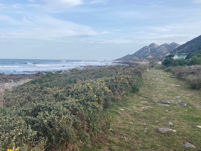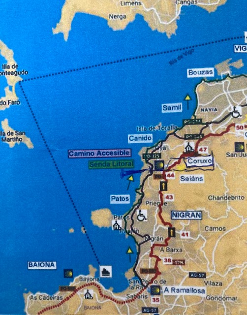 No me meten prisa. Ellos están preparándose para la apertura del medio día y no parece que les incomode. Han tenido un gran detalle conmigo. Y ahora sí, ahora me viene a la cabeza la velada de ayer. Las historias de Xabi y sus gestos. Me contó, llevándome al otro lado de la carretera para mostrarme la gran piedra de color rojizo, como los pescadores, que solían venir desde La Guardia en botes, desembarcaban por las zonas habitadas para intercambiar pesca por comida y a veces alojamiento. Y esa piedra rojiza era la que les guiaba. Y claro, los días tormentosos no tardaron en llenar mis pensamientos. Vida dura; vida a fin de cuentas. Miro una vez más el mapa del camino y observo como la costa, desde La Guardia hasta Oia, es prácticamente rectilínea. ¿Motivo? Una falla. Es normal ir para adelante y hacia atrás mentalmente. Muchas horas de camino y de soledad verbal.
