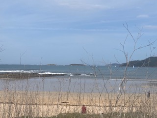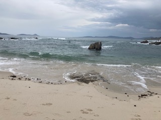 Antes de darme cuenta, vuelvo al borde del mar. Una constante en este camino. Y el pequeño salto me hace caer de nuevo en un arenal que acoge una escuela de surf. Hoy es día de competición y eso hace que esté bullicioso el lugar, entre música al aire y constantes carteles de sponsors. He reducido la cadencia en el paso porque de seguir así, voy a llegar con demasiada antelación al destino, por fin decidido parar hoy.