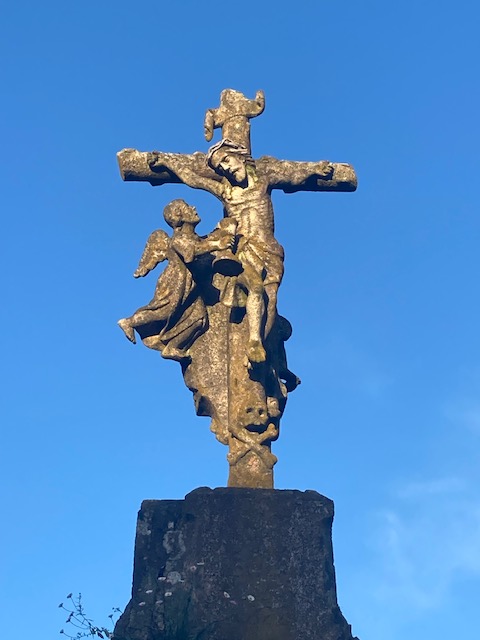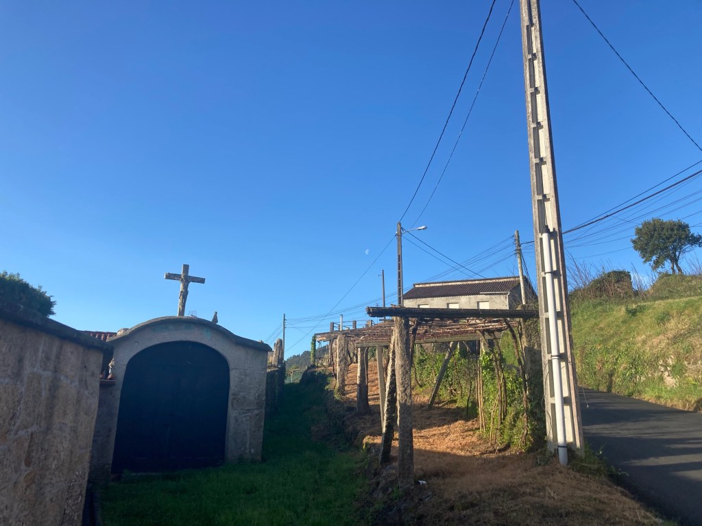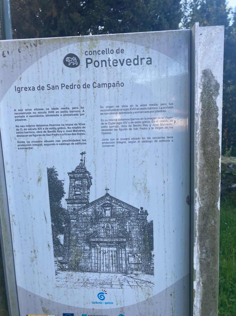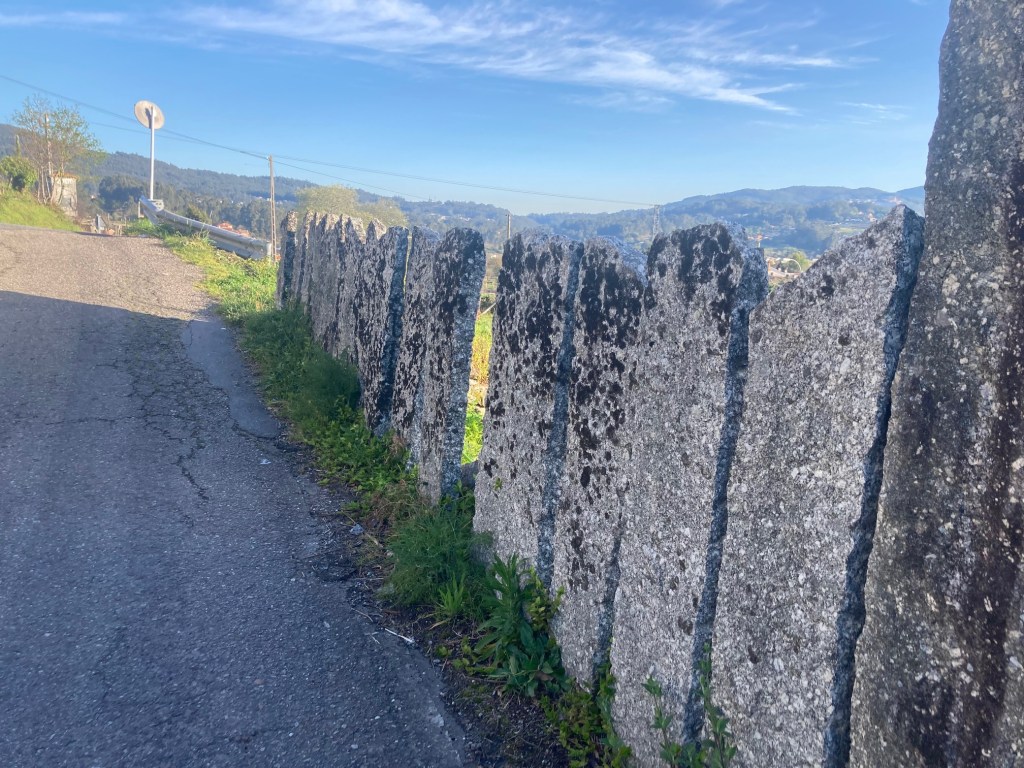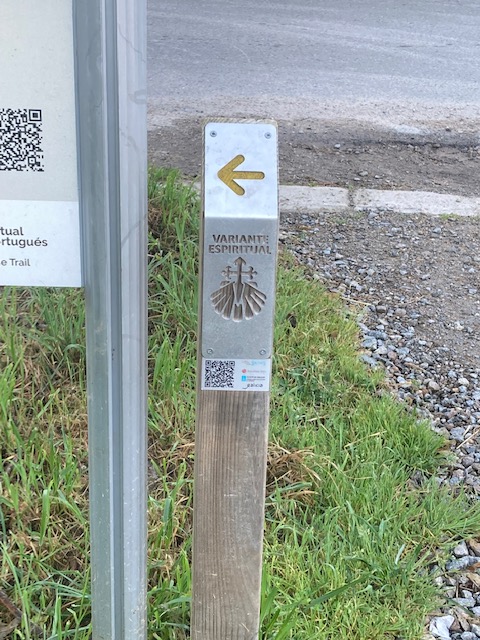 Mejor pongo los pies en tierra nuevamente (y la cabeza en su sitio) y sigo las indicaciones del camino. Han pasado 2,8 km y el desvío para la variante aparece. Un aljibe elevado parece puesto ex profeso como indicador añadido ante cualquier duda sobre la ruta a seguir. Es complicado no caer en los influjos que provoca este maravilloso espacio natural sobre mi espíritu (creo que hoy estoy excediéndome con el trato espiritual). Al menos en estos momentos. El gran cartel del desvío hacia la Variante Espiritual es tan perceptible que sería un sacrilegio no tomar ese camino. Una pequeña carretera me lleva a introducirme en él de manera pausada. Entre los pensamientos de todo tipo, me muevo por muros viejos, casas abandonadas, carteles con anuncio de peligro tren, inicios de cuesta… Cuestas que me llevan hacia un Sol que se eleva con facilidad desde el Este y que riega de claridad la ya cada vez más lejana Pontevedra. Durante la ascensión constante, al tiempo que me alejo, me acerco a un nuevo pueblo con casas de aspecto antiguo y cercadas por viñedos y algún que otro hórreo que provoca que vuelva a dar alas a la imaginación. Entre tantos silencios, un sonido de campanario que comunica la muerte. Toque de muerte le llaman. Desde el inicio casi de la ascensión he venido oyendo el sonido pausado que llenaba todo el entorno. Dependiendo de los tonos se sabe si es fallecido o fallecida… ¿Quién estará tañendo la campana? En medio de este paisaje de espectacular belleza, ese sonido puede provocar tanto dolor en esas familias que no llego a ponerme en su lugar. Tener que escuchar constantemente que has perdido algo querido… Al que camina, o sea yo, el repicar sereno y constante le supone un sentimiento de análisis sobre lo que significa poder vivir entre tantas pérdidas.