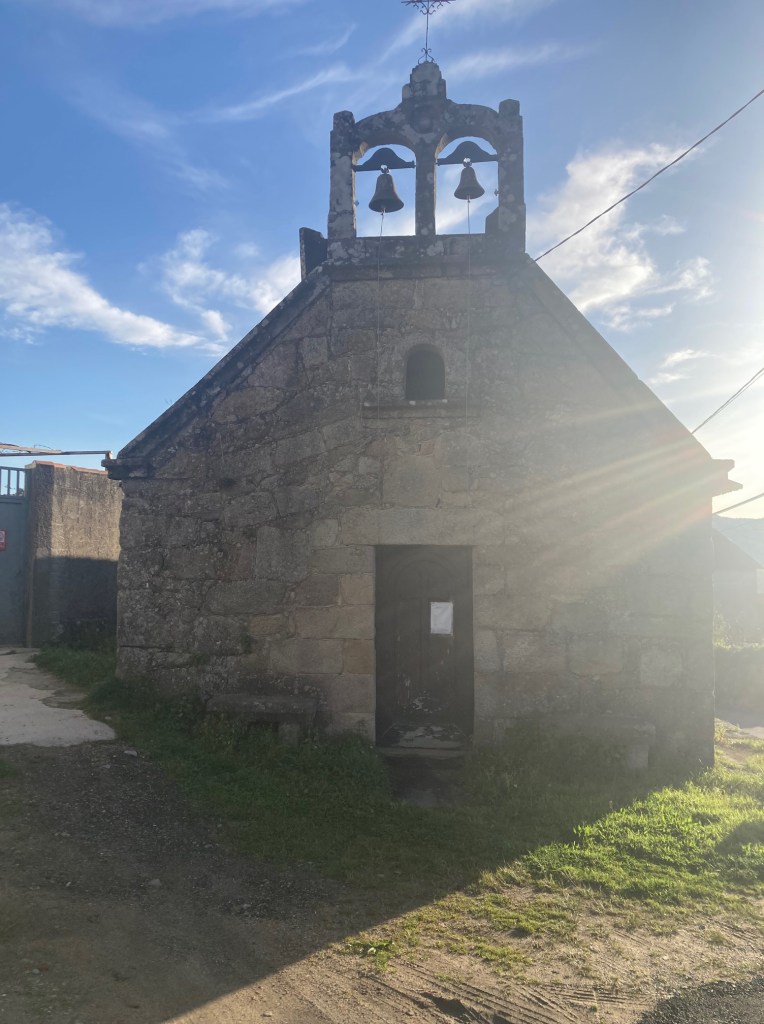 La señalización de la ruta es perfecta en esta parte del camino. Eso me ayuda a relajarme y tomarme la subida constante de manera más llevadera. Las pendientes se suceden y son bastante pronunciadas. A veces el camino no llega casi ni a senda. La vegetación intenta recuperar los espacios perdidos y de vez en cuando casi lo consigue. Con una anchura de no más de medio metro comienzo un nuevo tramo de ascenso imposible que me lleva hasta la proximidad de una carretera, delatada por el sonido de algún que otro vehículo a motor. Las campanas están ya tan cerca que casi las puedo ver. Se ensancha el final de la subida y el suelo se llena de algo parecido a cantos rodados justo antes de encontrarme con el origen del sonido que me ha venido guiando la última hora. Un rato delante de la pequeña iglesia para tomar aliento y vuelvo al camino. No me apetecía leer sobre las almas que abandonan este mundo. Esperaba ver a alguien tañendo esas campanas pero la modernidad ha traído la automatización del servicio del campanario. Al menos en este lugar.