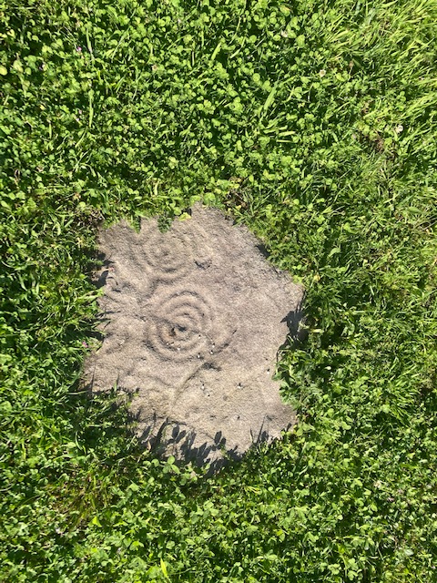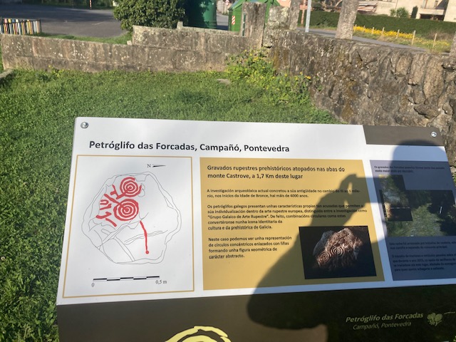 Nada más comenzar a andar de nuevo, me topo con una zona donde hay Petroglifos. Concretamente se les conoce como los Petroglifos de Forcada. Son círculos concéntricos realizados sobre piedras y que están enlazados con líneas formando una figura geométrica abstracta. El camino va intercalando aspectos diferentes. Lo mismo me doy una vuelta por el poco atractivo bosque de eucaliptus que me enfrento a la más absoluta carencia de sombras de origen vegetal. Lo malo (también) de caminar amparado por los eucaliptus es la excesiva pérdida de hojas que llenan todo el suelo, ya que si llueve, se convertiría en pista, pero de patinaje.