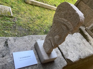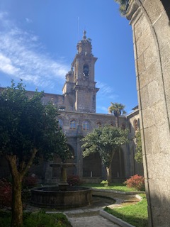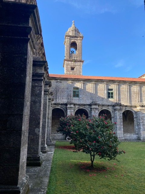 En este tiempo que he estado husmeando por el Monasterio, llamado por cierto San Juan de Poio, he podido constatar que se trata de un complejo espectacular. Es Monumento Artístico desde 1971 y lo curioso es que no se conoce la fecha de su fundación. Se «sospecha» que fue S. Fructuoso de Braga el que lo creó en su origen, sobre el siglo VII. Éste fue Monje, Obispo y se dedicó a fundar monasterios por todo el occidente europeo. Algo parecido a un «Zara» de hoy en día. El monasterio se convirtió en algo importante, hasta el punto de ser centro cultural y económico de la zona y obtuvo dádivas bastantes generosas. Como ejemplo, Doña Urraca les donó el puerto de Combarro, además de otros terrenos y Carlos V le concedió el privilegio de crear un colegio mayor de teología, contando, entre otros, con el Ilustre Maestro Padre Feijoo. Y como en otros tantos relatos que he ido dejando en días anteriores, la desamortización también intervino haciéndoles perder cualquier privilegio que tuvieran. Tras el abandono de alguna Orden (La de S. Benito, por ejemplo) aparece una nueva Orden (de la Merced) que crea escuelas de gran importancia. El Monasterio, con sus casi 40.000 metros cuadrados, abarca el Convento Benedictino (2 claustros), una ampliación (con otros 2 claustros), una iglesia, huertas, viñas y un enorme hórreo de casi 124 metros. Tiene una fachada barroca, un retablo churriguresco y un mosaico impresionante del Camino de Santiago. Esto último entendible porque acunó una escuela de mosaicos. La fuente que acoge en su seno está alimentada a través de una tubería de piedra (me recuerda a las de Pontevedra). Su historia me ha cautivado y el espacio me ha impresionado. Una última mirada al complejo y reanudo el caminar. El resto de viaje me llevará desde los 0 metros de altitud hasta los 300. Intuyo/deseo que las vistas que me quedan por ver serán increíbles. No pierdo nada por intuir (y por ejercer el derecho al deseo). Ah, me olvidaba, la visita por su interior me ha costado 2.5 Euros.