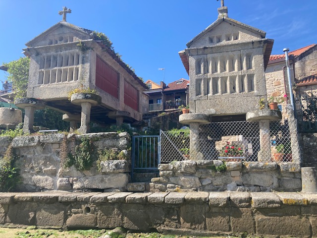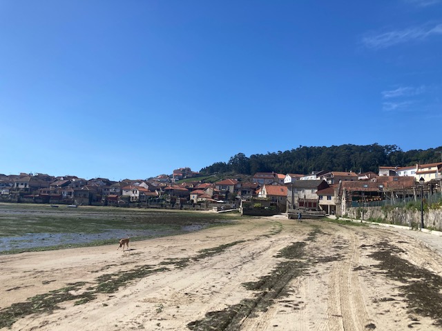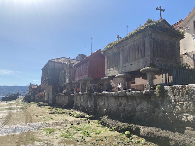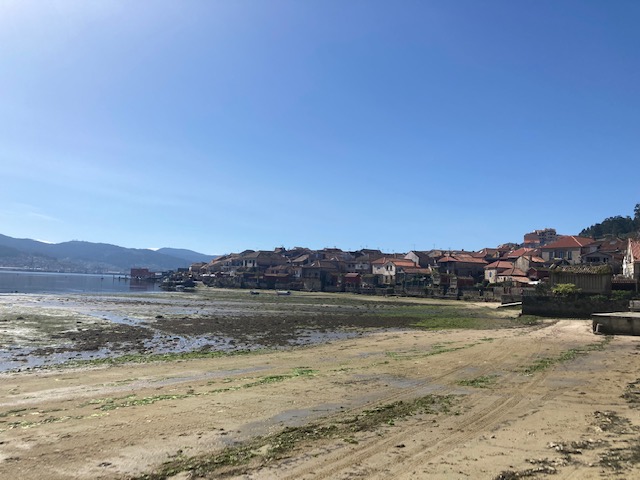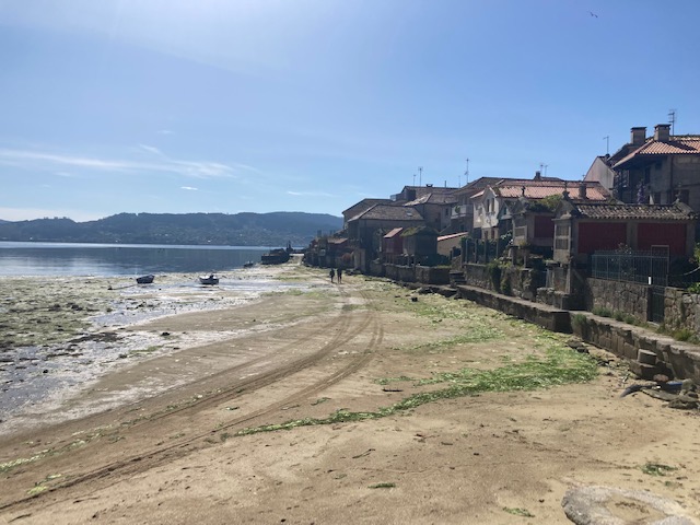 Según mis cuentas, hasta el final de mi destino hay unos once kilómetros. Espero que no sea todo una larga y tortuosa cuesta. De hecho, aun no ha empezado. Paso por un colegio de personajes muy pequeños que llenan de gritos, risas y lloros el ambiente. Hace mucho calor y el Sol…brilla. Entre algunas subidas y bajadas tenues, me pregunto donde empezará la anunciada cuesta. Ya estoy a pie de ría, o sea, debo empezar el ascenso. Y a pie de ría está Combarro. Me gustaría tener el don de las palabras precisas para describir este pueblo. La marea baja deja un paseo por el arenal que hace de frontera, ahora, entre el pueblo y el mar. Me acerco pisando su húmeda arena y contemplo, como una visión divina, el pueblo. Pegado a las edificaciones hay una pasarela que sirve de camino para cuando la marea está alta. Al borde de este mar de ría, un ramillete de bares y restaurantes compiten por el privilegio de la acogida de visitantes. Todo a pie de ría. No puedo dejar pasar la oportunidad de sentarme en una de las mesas. Me atrevo a degustar un Albariño mientras me relajo y me fusiono con esto que no tiene adjetivos. Tal vez podría calificarlo como refugio para dioses o palacio para los pensadores. Da igual la calificación. Lo importante es lo que trasmite.