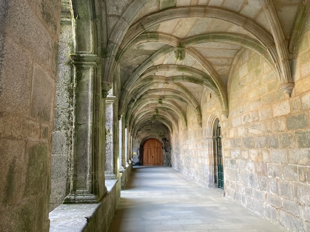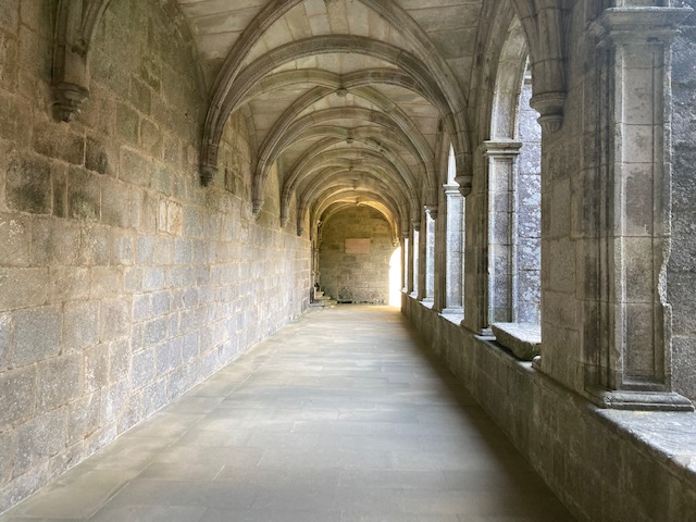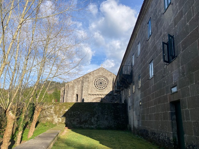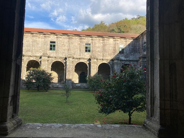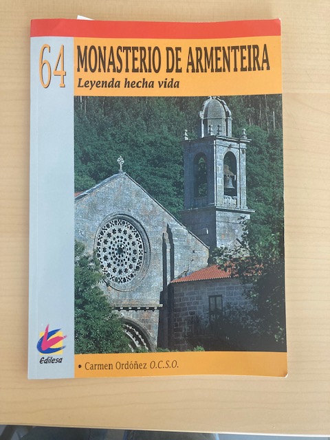 Un padre me atiende en la recepción. Me cuenta casi en susurros que es el único varón del monasterio. Entiendo sus susurros aunque tal vez lo esté interpretando erróneamente. El caso es que me cuenta historias del lugar mientras estamos a solas esperando la llegada de la hermana encargada del control de huéspedes, que será la que me cobre el alojamiento. Me nota cansado e intenta darme ánimos explicándome que la etapa venidera será de bajada. Su explicación del por qué, es de una lógica aplastante. «Aquí nace un rio, por tanto, tiene que ser bajada si sigo su compañía». De vez en cuando me suelta alguna frase profunda, supongo que producto de su experiencia y edad. «Toda leyenda esconde una verdad», me dice mientras sonríe sabedor de mi afán por oírle. Me ilustra hablándome, entre otras cosas, del nombre que recibe la zona. Castrove se denomina a este monte. La conversación se ve interrumpida con la llegada de la monja que me atendió por teléfono. Creo que es la única que habla con el exterior de estos muros. Se toma la libertad de bromear sobre mi caminata desde el momento que habló conmigo hasta llegar aquí. Bromas divinas, supongo. Prefieren que el pago sea en metálico. Ya me había avisado. Al mismo tiempo que le pago el alojamiento, les compro un libro sobre el Monasterio. «Monasterio de Armenteira. Leyenda hecha vida». De Carmen Ordóñez O.C.S.O.