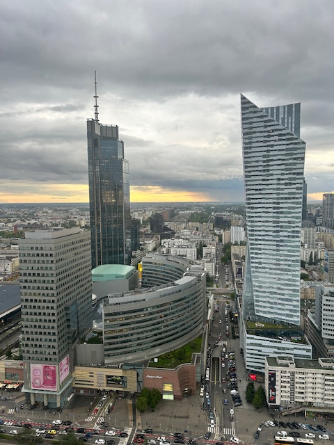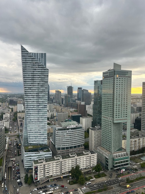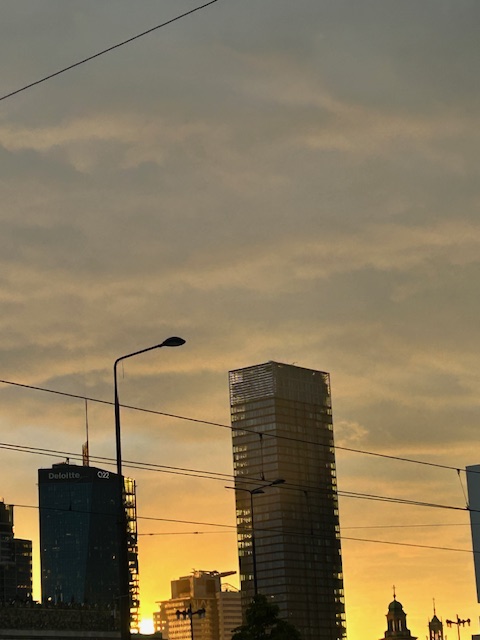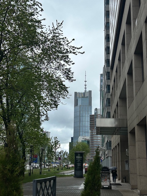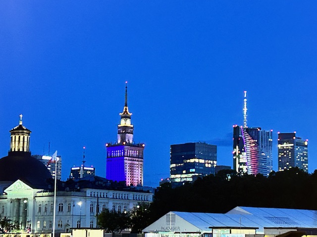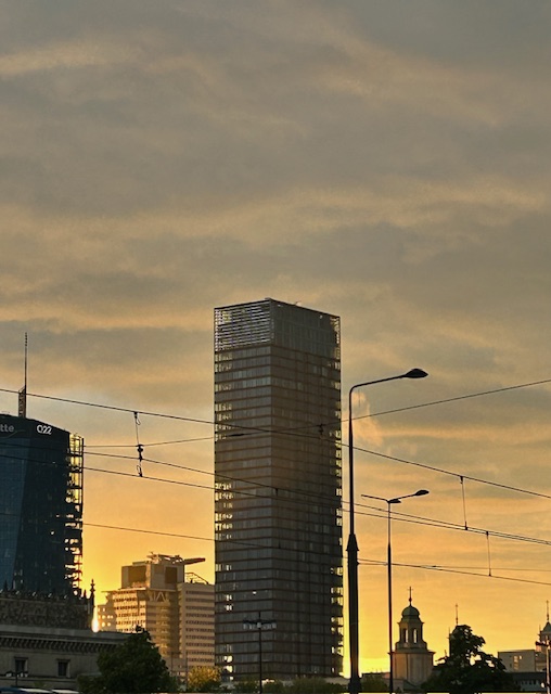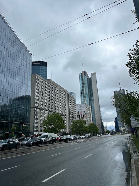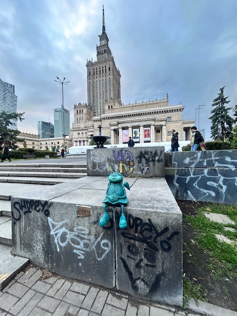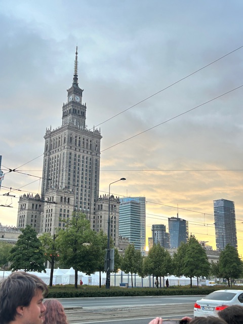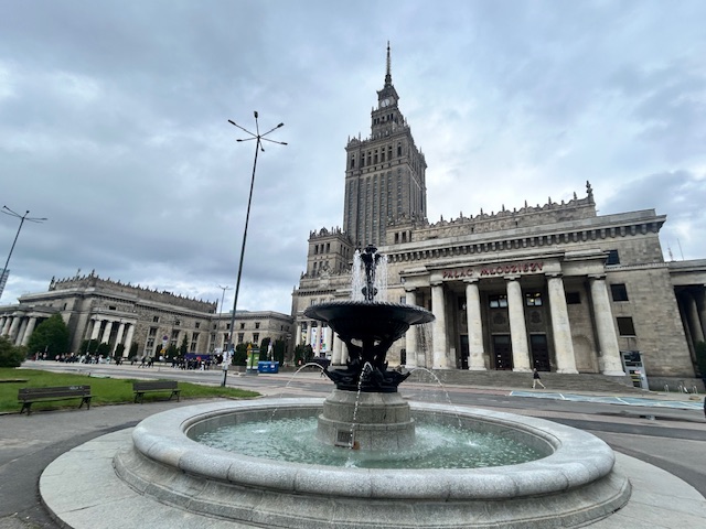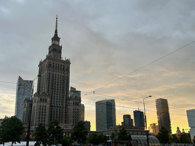 Desde una relativa lejanía, nos habla del Palacio de Ciencia y Cultura. Incide sobre el color de su fachada, grisáceo, para informarnos de que era blanco de construcción. ¿Contaminación? Según ella, hay bastante gente a la que no le gusta su historia y su apariencia. Pasó de llevar la coletilla Stalin hasta que, en la actualidad, cada vez se le respeta un poco más. Me refiero a la edificación, claro. La dominación soviética trajo algunos de estos edificios a las calles de países anexionados. Se le conoce como Pekin, como abreviatura de su nombre en polaco. Los 237 metros de altura hacen de el uno de los más altos de Polonia.