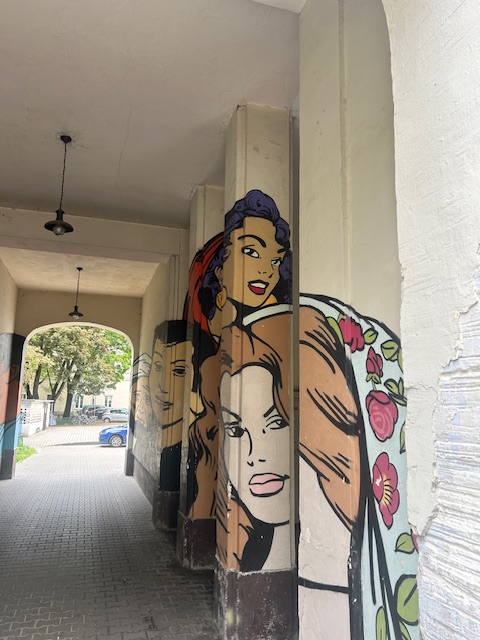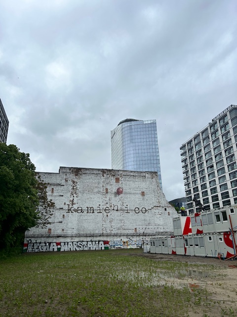 Seguimos el camino y nos detenemos ante una pared que se supone pertenecía a un edificio. Este fue destruido también en la segunda guerra. Lo que nos quiere mostrar es un grafiti de tan solo una frase que, separadas las palabras a modo de juego de ellas, viene a decir «¿Piedra y qué más?»