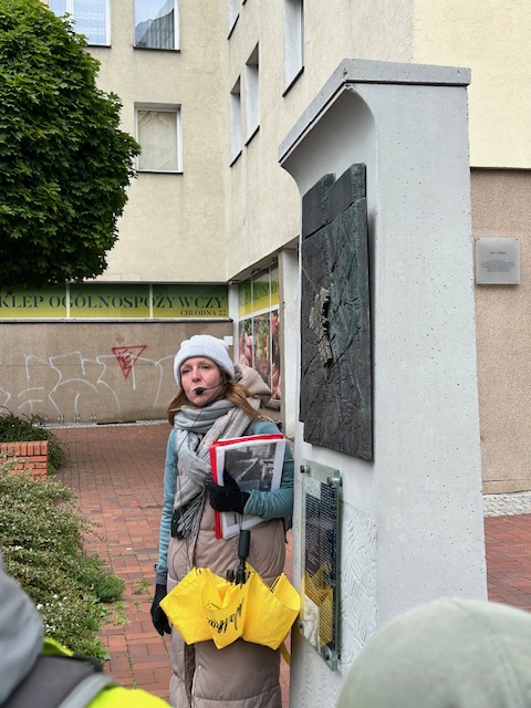 En la parada inmediata, nos relata el plan de la visita. Pasearemos por El Gueto Pequeño, posteriormente veríamos La calle Chlodna, en donde se construyó un puente, por los nazis, para que los judíos pudieran pasar de un lado al otro sin pisar la calle, que por aquel entonces era una importantísima vía de comunicación. Su estructura era de madera y mientras pasaban por el, podían observar como alemanes y polacos transitaban con total normalidad por la calle. El puente no existe en la actualidad, pero si un monumento que lo conmemora.